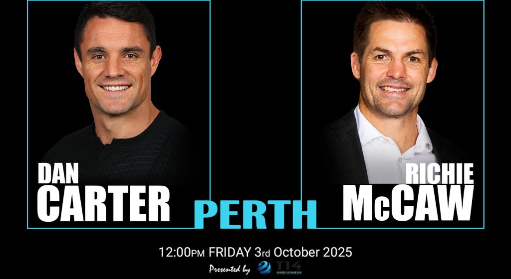 All Black SUPERSTARS Richie McCaw and Dan Carter LIVE on stage for a Lunch Event at Optus Stadium Perth. The day before Game 2 of The 2025 Bledisloe Cup.